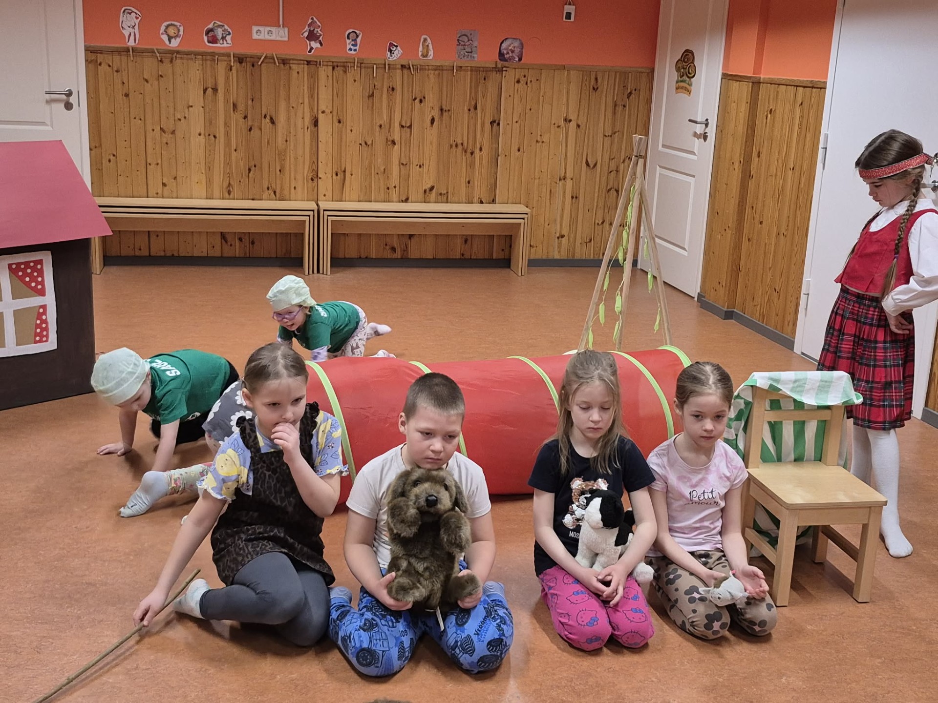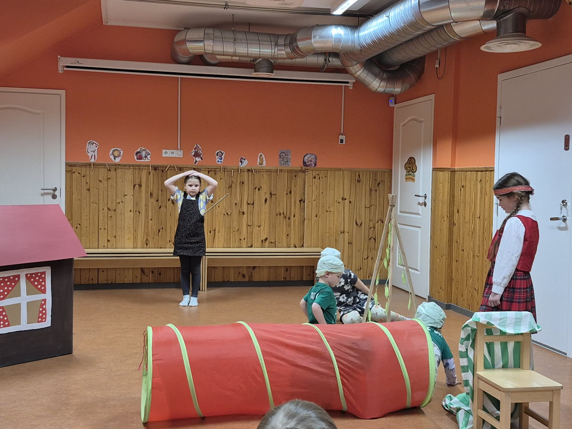Rühmades õpiti selgeks eesti lastejuttude ja muinasjuttude põhjal tehtud dramatiseeringud. Männiriisika rühm etendas Julius Oro jutukese „Muna“, mis seekord esitati varjuteatri formaadis. Kuuseriisika lapsed esitasid traditsioonilise lavastuse Setu muinasjutu ainetel „Herned ei lähe kotti.“